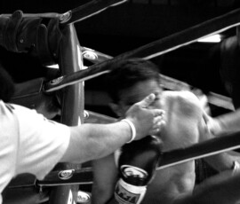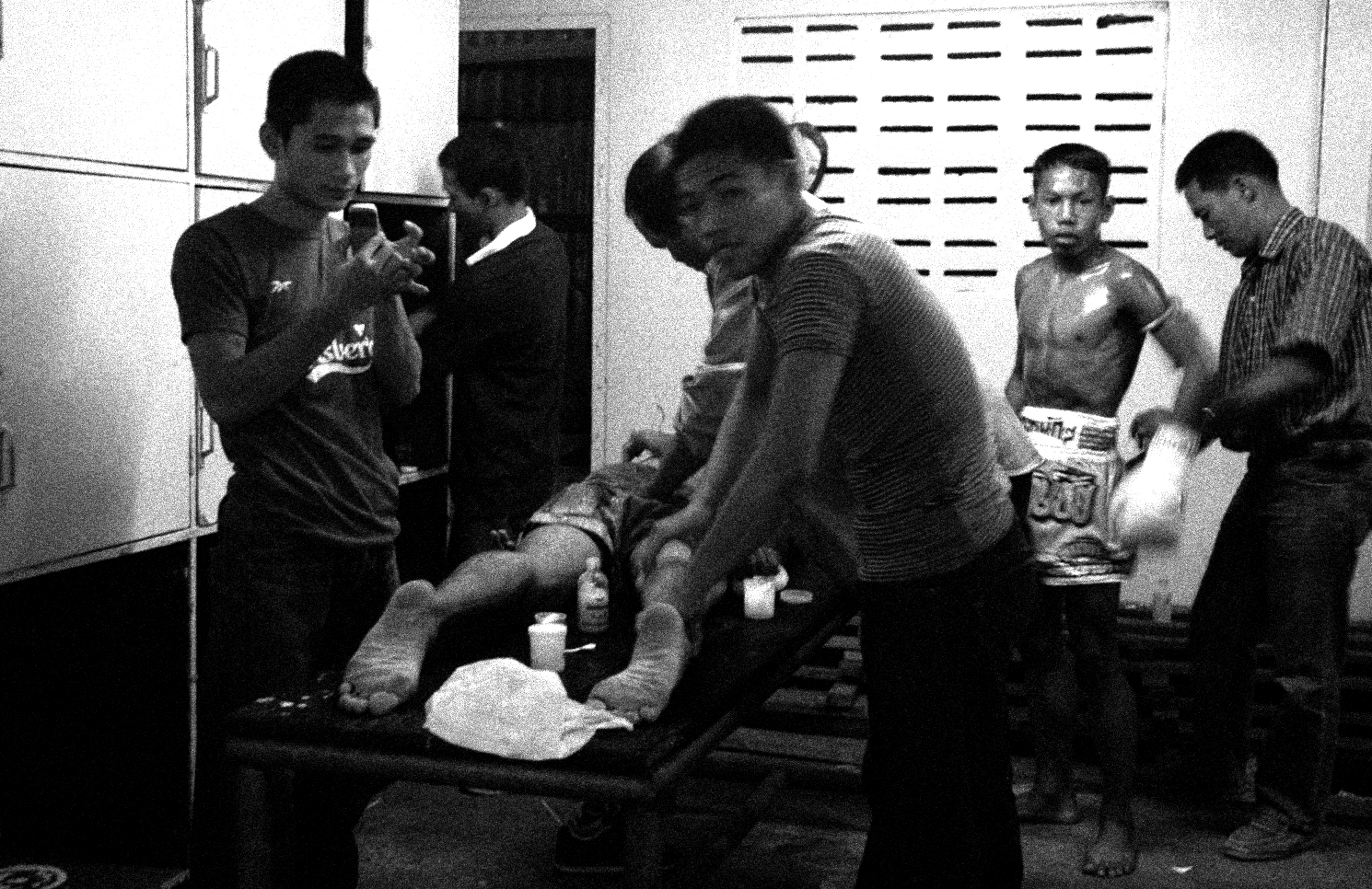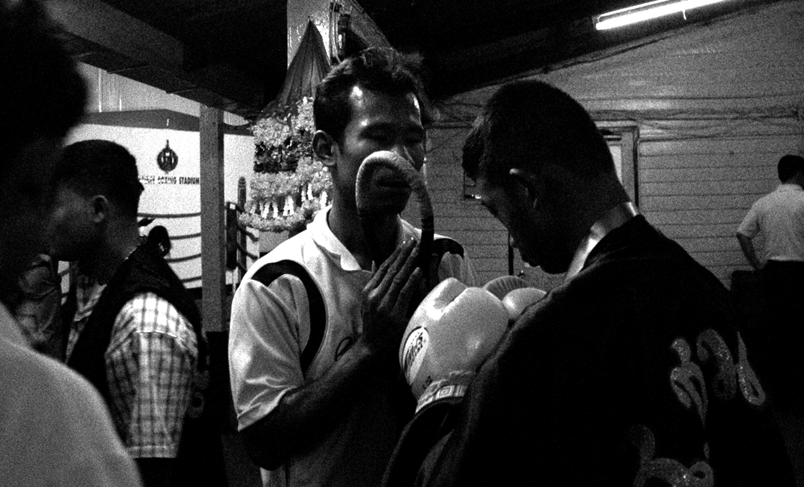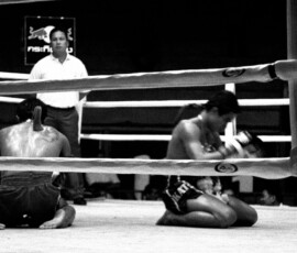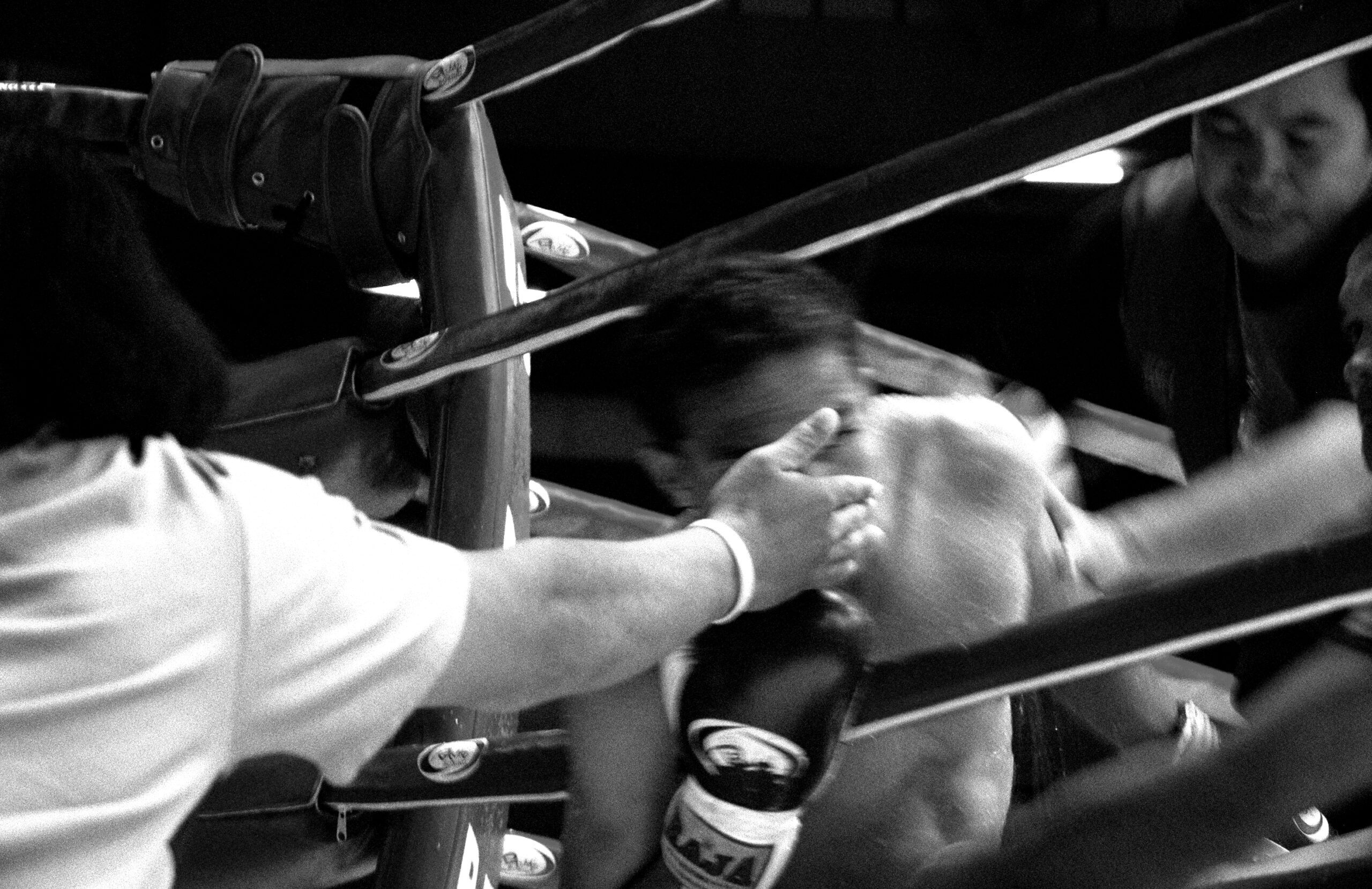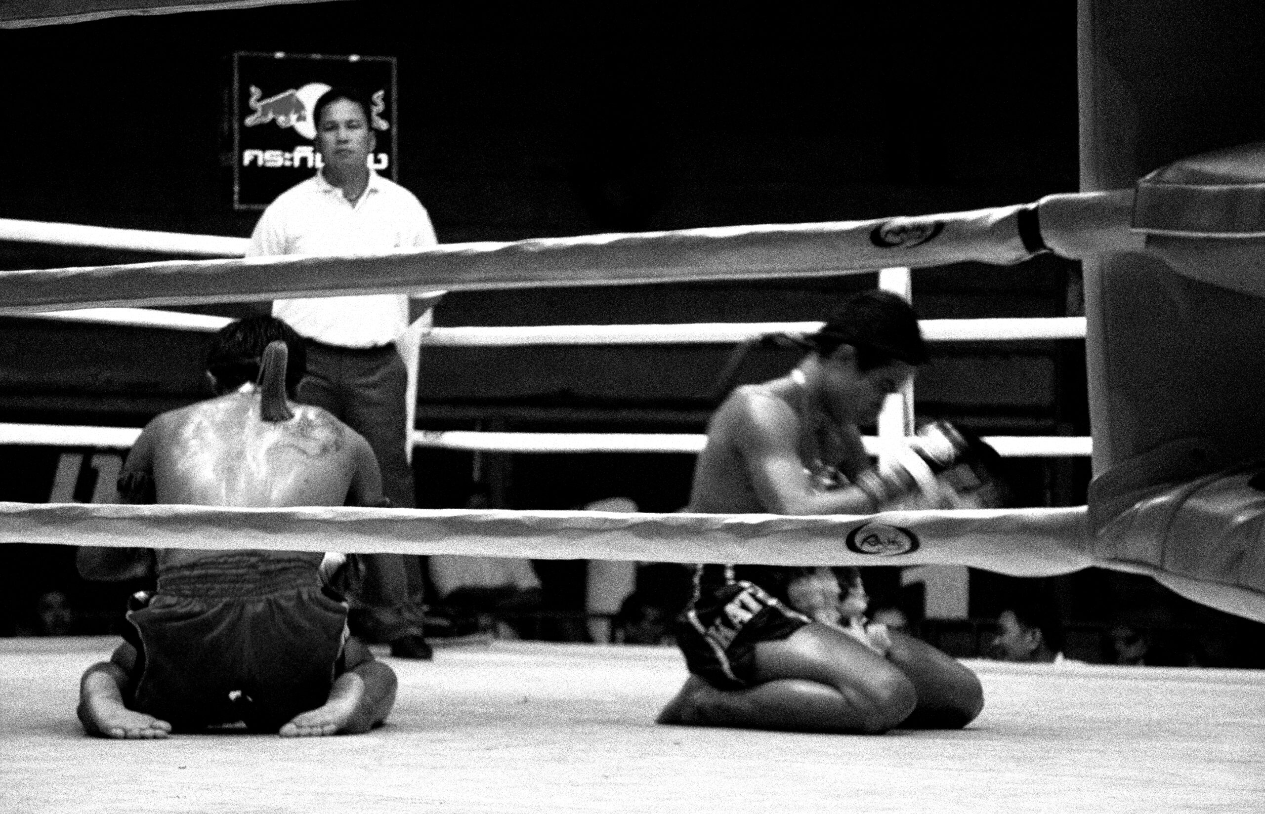 This series was photographed at the old Lumphini Stadium in Bangkok, a place that no longer exists, but that for decades stood as one of the most charged and iconic spaces in the world of Muay Thai. The images move between the ring and its surrounding atmosphere: moments of combat, preparation, waiting, exhaustion, and watchfulness. Rather than isolating the fight as spectacle, the series attends to the wider field that sustains it—the gestures around the event, the tension before impact, the fatigue after contact, and the collective intensity that binds fighters, trainers, gamblers, and spectators.